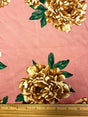 • Carnation pink scuba knit fabric with gold, tan, cream, and green floral print, perfect for bold dresses, skirts, and activewear