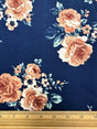 - Smooth scuba knit fabric with navy, peach, ivory, green, teal, and rust floral print, perfect for apparel and activewear projects