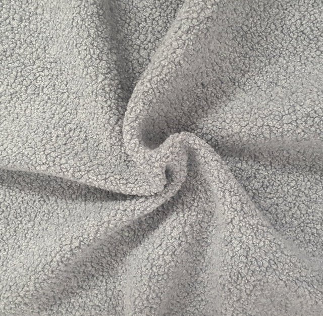 This cozy gray sherpa fleece knit combines the warmth and texture of wool with soft synthetic fibers for a plush, insulating fabric ideal for cold weather garments and accessories. The wool blend enhances durability and natural warmth, while the sherpa fleece surface offers a luxurious, fluffy texture perfect for jackets, hoodies, blankets, and winter layering pieces.