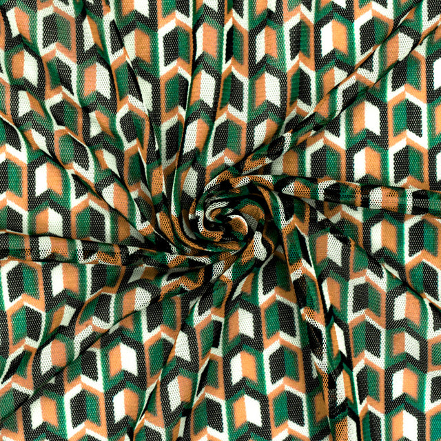 - Green, white, black, and light orange geometric arrow print mesh knit fabric with a sheer, textured finish, perfect for overlays, dancewear, and activewear