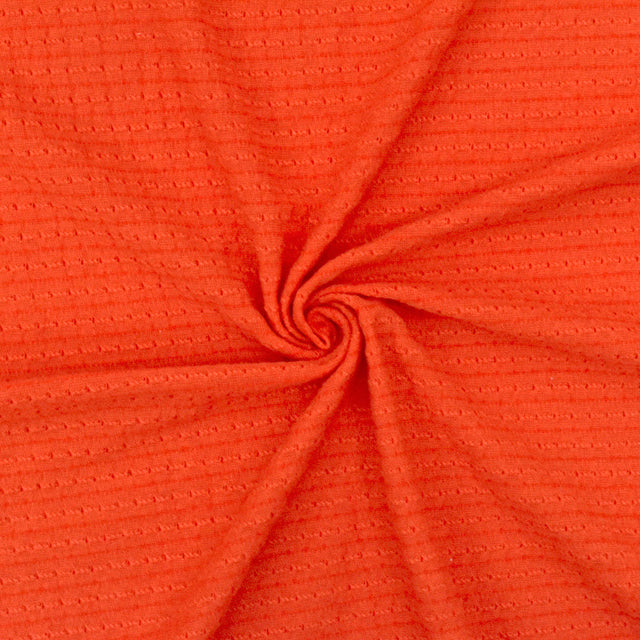 • Fire orange stripe textured jersey knit fabric with a dot-like pattern and soft, matte finish, perfect for stylish blouses, dancewear, and activewear
