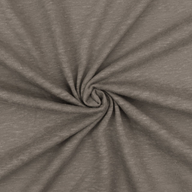 Discover the unique texture and comfortable stretch of this Latte Taupe Brown Slub Stretch Jersey Knit Fabric, crafted from a polyester-cotton-spandex blend. This lightweight, semi-sheer fabric offers horizontal, bias, and slight vertical stretch, providing excellent flexibility for various apparel needs.