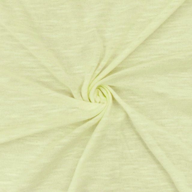 Discover the soft texture and comfortable stretch of this Faint Lime Yellow Slub Stretch Jersey Knit Fabric. Made from a cotton-polyester-spandex blend, this lightweight fabric features subtle slubs for a natural textured look. With horizontal, bias, and slight vertical stretch, it offers excellent flexibility and a very good drape.