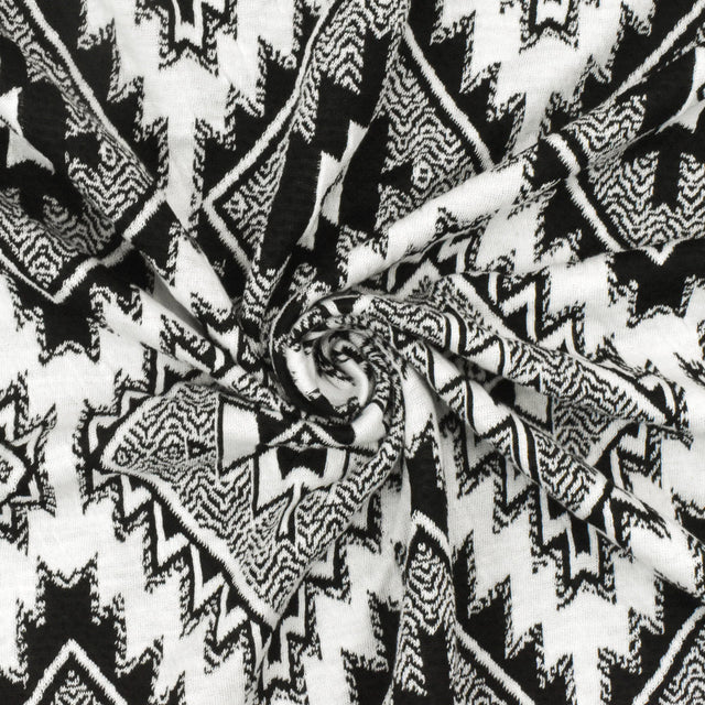 This Simple Black-White Aztec Jacquard Stretch Poly Double Knit Fabric features a bold diamond Aztec-inspired pattern on the front and a complementary striped jacquard on the reverse. Crafted from a soft and textured blend of 97% polyester and 3% spandex, this double knit fabric offers horizontal, bias, and moderate vertical stretch, making it versatile for both structured and drapey apparel.