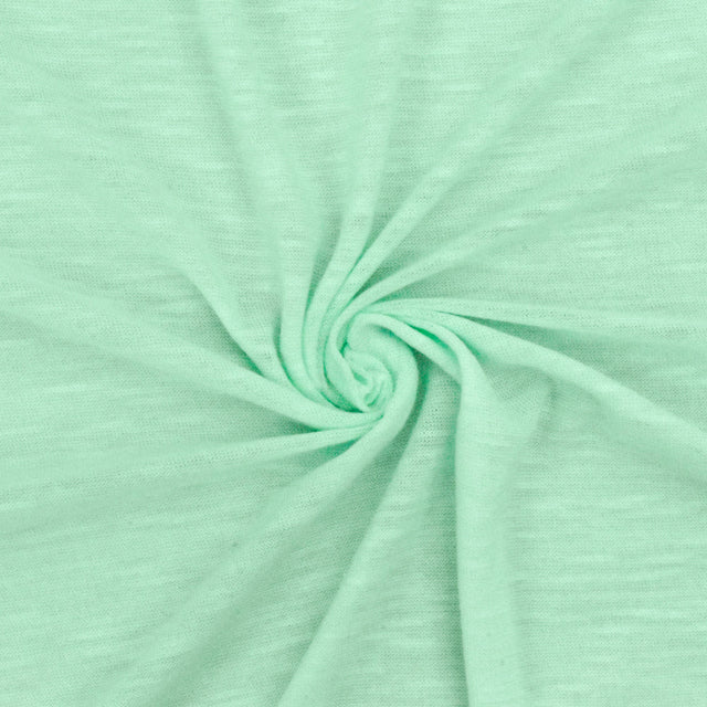 This Mint Green Slub Stretch Jersey Knit Fabric is a breathable, lightweight knit ideal for everyday wear and creative apparel projects. Made from a blend of cotton, polyester, and spandex, it offers excellent softness and comfort with gentle horizontal, bias, and slight vertical stretch.