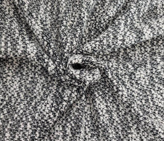 This soft and stretchy yarn dyed sweater knit features a classic black and white heathered look. Its rayon blend composition offers a breathable, cozy drape that is perfect for layering pieces and relaxed silhouettes. The lightweight knit structure makes it suitable for both transitional and cool weather garments. Sold by the yard, and orders over one yard ship as a continuous piece.
