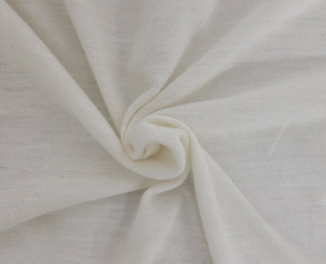 This ivory wool blend jersey knit offers a soft hand, gentle stretch, and cozy warmth perfect for cooler weather projects. Blending natural wool with synthetic fibers, it provides breathable insulation with enhanced durability and shape retention. The smooth jersey surface and neutral ivory tone make it ideal for layering pieces, turtlenecks, scarves, cardigans, and fashion basics with a timeless feel.