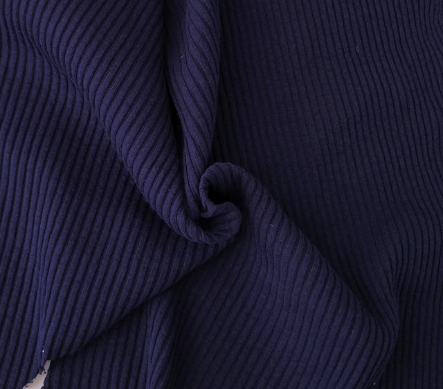 This Navy 4x4 Rib Knit Cotton Spandex Fabric offers a deep navy hue paired with a distinctive 4x4 rib texture for enhanced elasticity and style. The cotton spandex blend delivers a soft, breathable feel with excellent stretch and recovery, perfect for comfortable, fitted apparel and layering pieces.