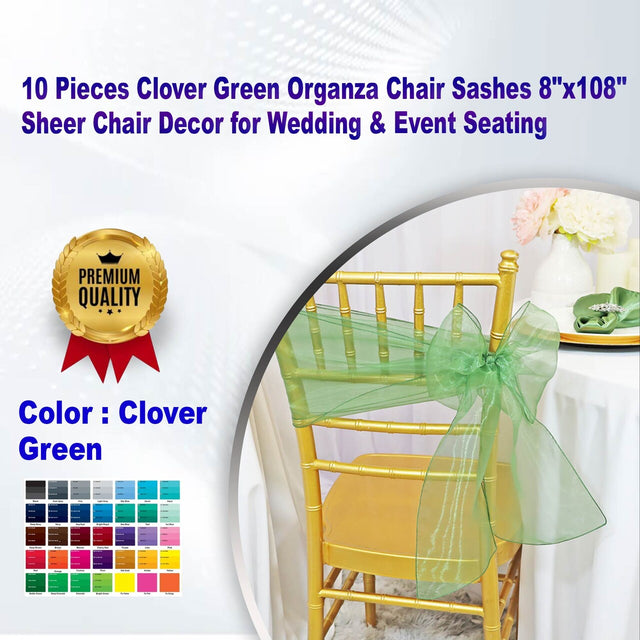10 Pieces Clover Green Organza Chair Sashes 8"x108" Sheer Chair Decor for Wedding & Event Seating