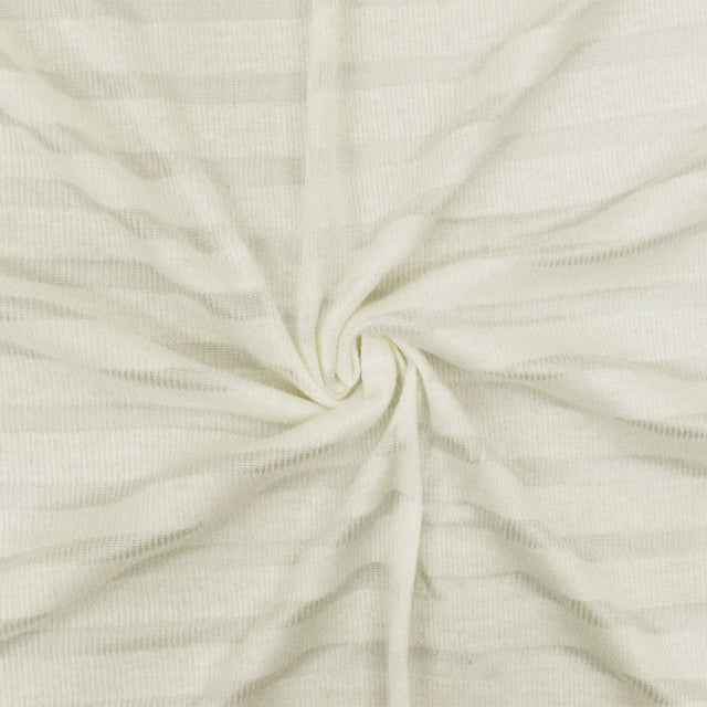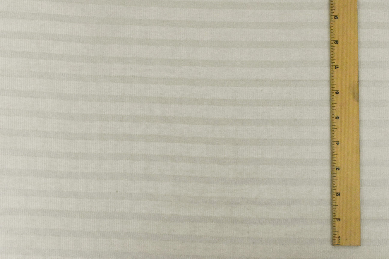 This ivory stripe stretch cotton 2X2 rib knit fabric is perfect for creating stylish apparel, activewear, blouses, and dresses. Featuring a soft texture and very good drape, it offers comfort and flexibility for both casual and performance wear. The semi-sheer finish with low luster adds a refined look to any garment project. Easy to care for and machine washable, this fabric is an excellent choice for breathable and versatile clothing designs.