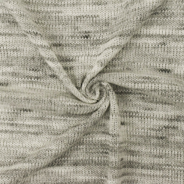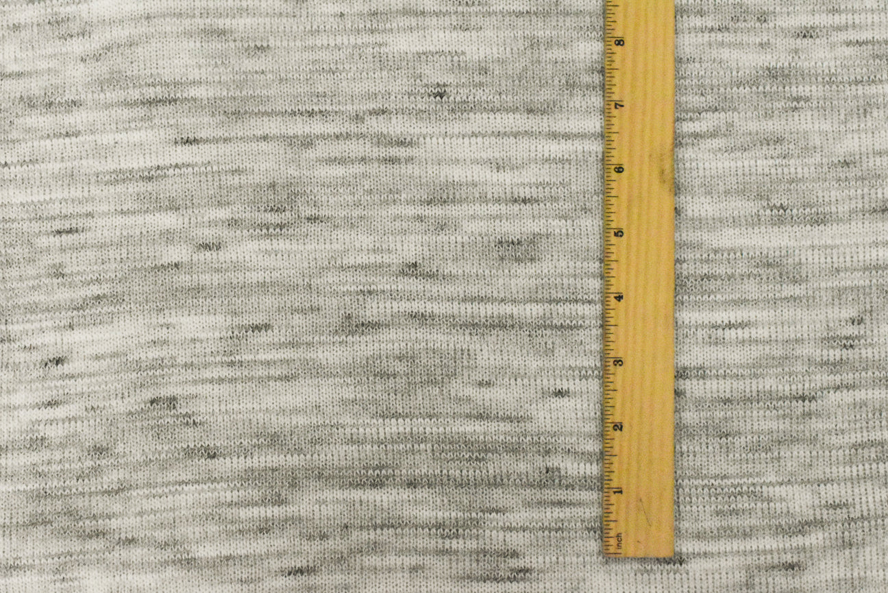 This fabric is a lightweight slub stretch jersey knit in a soft blend of Pale Ivory, White, and Black. It features a dry textured hand feel with visible slub texture, adding natural character to your projects. With good four way stretch and a soft drape, this fabric is ideal for making everyday tops, dresses, and loungewear. The fabric has a semi sheer appearance and is great for breathable layering pieces.