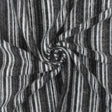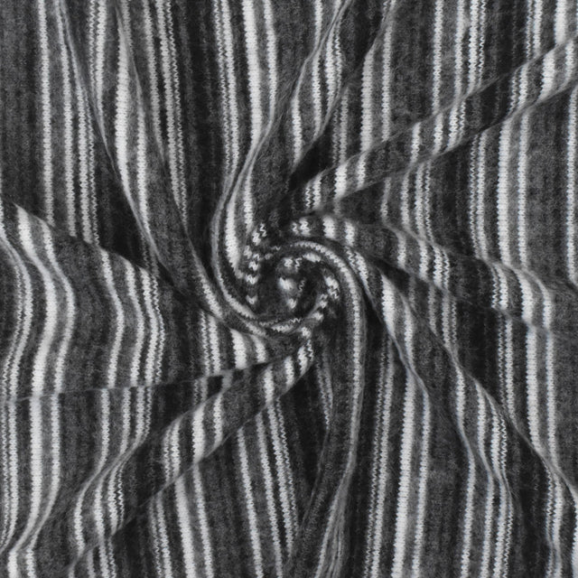 This fabric features a soft brushed face with a classic stripe pattern in black white and shadow gray. Made from polyester rayon and spandex it offers four way stretch and a light weight for comfortable wear. The opaque fabric has a very good drape making it ideal for casual tops dresses and loungewear.
