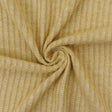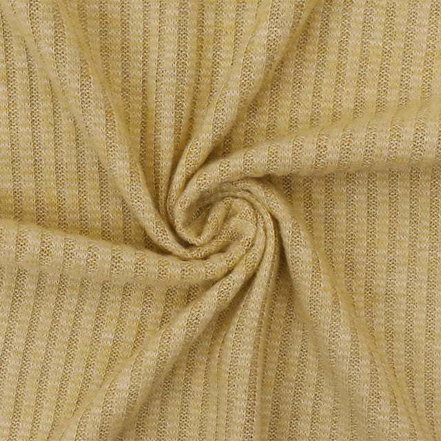 This fabric is a stretch rib knit made from polyester and spandex with a soft brushed surface on one side. It features a 3 by 2 rib structure in a warm toasty beige and white color combination. The fabric is lightweight opaque and textured with four way stretch and good drape. Ideal for making tops dresses layering pieces and loungewear.