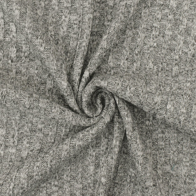 This textured stretch rib knit fabric features a balanced mix of space gray black and white tones. Made from polyester and spandex it has a soft textured surface and a structured 4x4 rib pattern. The fabric is lightweight and opaque with horizontal stretch moderate bias stretch and slight vertical stretch. It drapes well and is ideal for modern tops layering pieces fitted dresses and comfortable casualwear.