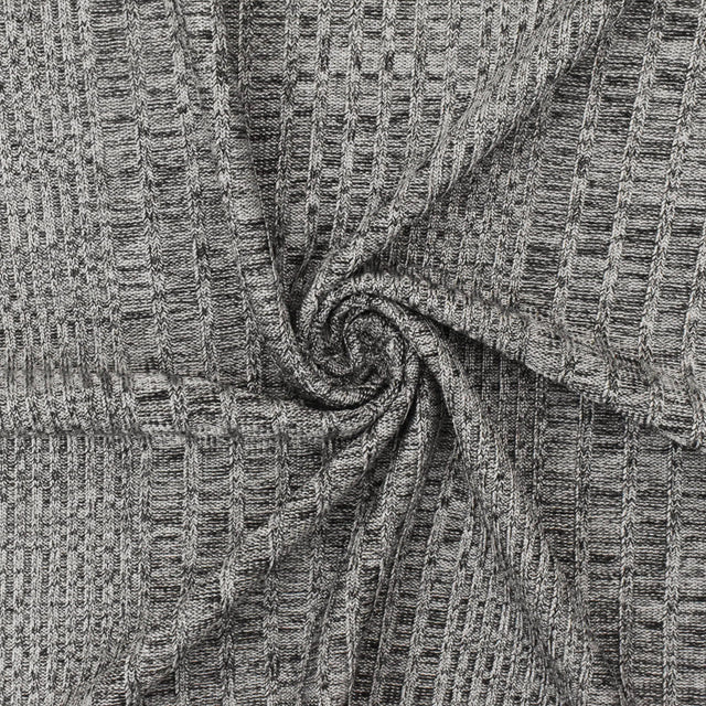 Texture stretch polyester 6x2 rib knit fabric in a stylish blend of black and moon silver. This lightweight, opaque fabric features a soft, textured hand with four-way stretch and good drape, perfect for activewear, apparel, blouses, and dresses. Machine washable for easy care.