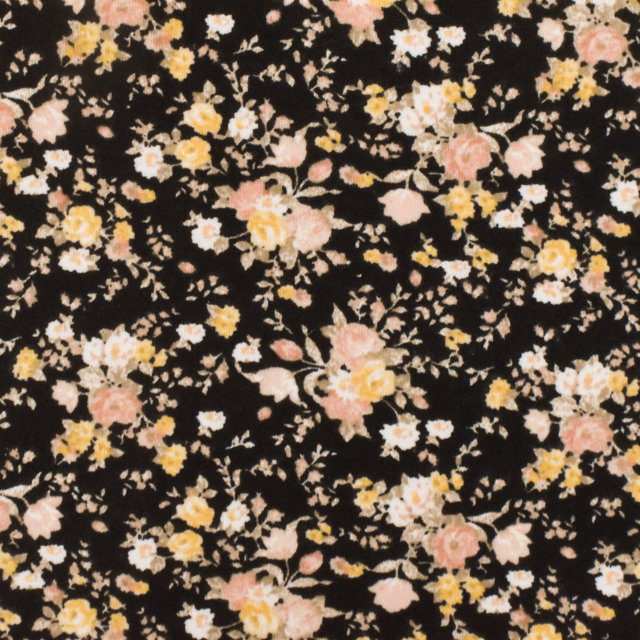 This soft and lightweight to medium-weight polyester jersey knit fabric features a delicate floral print in simple black white beige yellow light brown and soft pink. It offers comfortable horizontal vertical and bias stretch with a soft hand and very good drape. The fabric has a matte finish and is ideal for activewear apparel blouses dresses and dancewear.