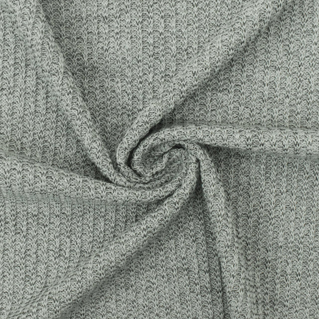 Textured stretch 2x2 rib knit fabric in black and light icy gray with subtle blue undertones. This lightweight, opaque fabric offers a soft, textured hand, four-way stretch, and good drape, ideal for activewear, apparel, blouses, and dresses. Machine wash cold, air dry recommended.