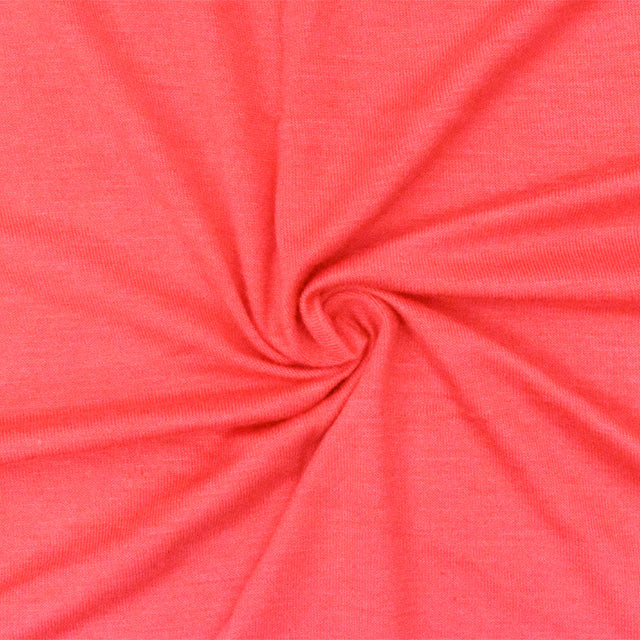 This lightweight jersey knit fabric features a beautiful coral red tone with pink undertones, offering a soft feel and excellent stretch in all directions. Made from rayon and spandex, it provides a smooth finish, great drape, and is ideal for creating stylish and comfortable apparel, including blouses, dresses, dancewear, activewear, and everyday tees.