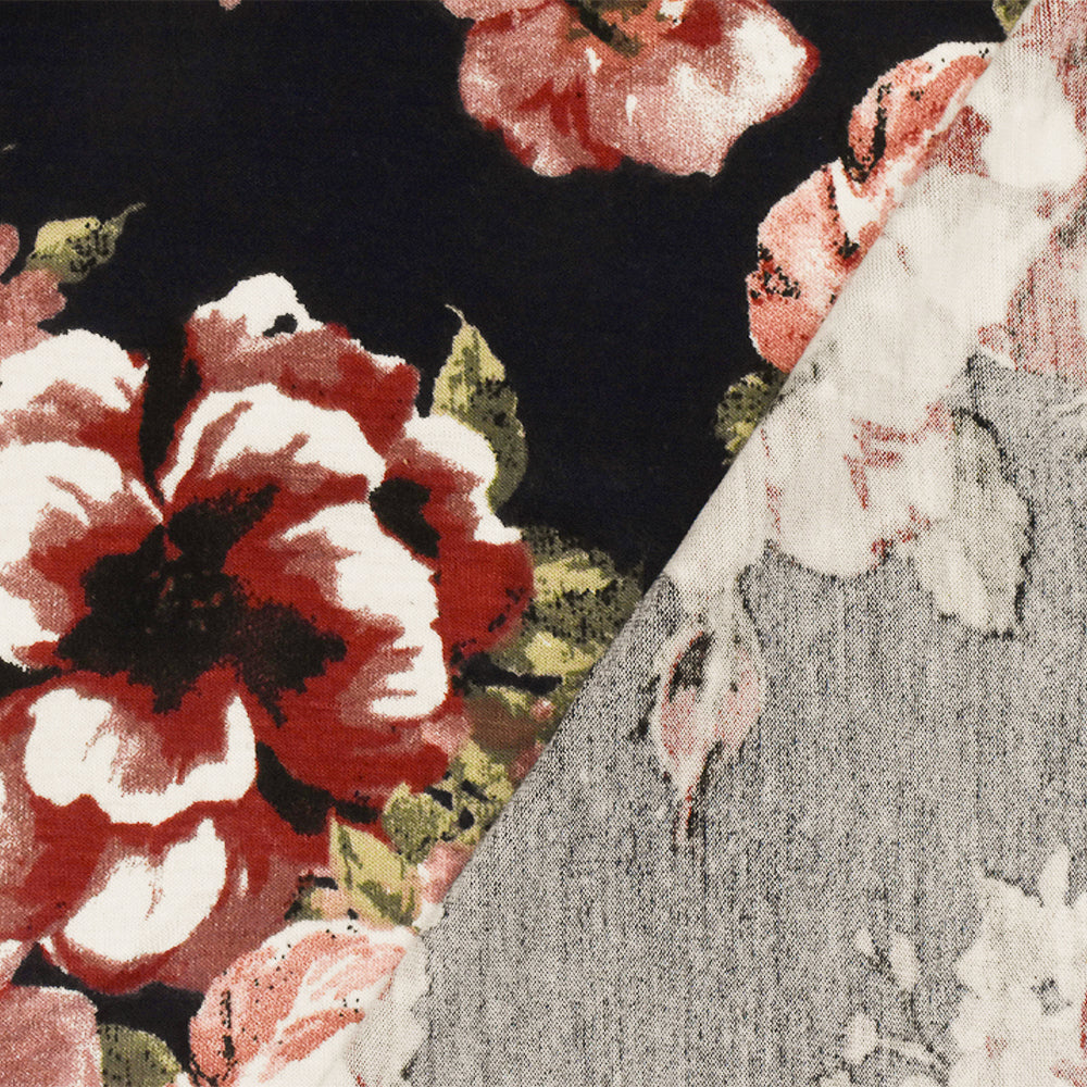 This lightweight and ultra-soft rayon jersey knit fabric showcases a beautiful floral print in night blue, dusty pink, rust red, and olive tones. With a very good drape and multi-directional stretch, it’s perfect for crafting elegant blouses, dresses, activewear, and dancewear that require comfort and flow. Its opaque body and subtle luster make it ideal for both casual and chic designs.