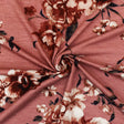 This lightweight rayon jersey knit fabric features a delicate floral print in dusty pink, rust red, navy blue, and ash tones, creating a soft and feminine aesthetic. It offers a smooth hand feel, very good drape, and flexible stretch across multiple directions. Perfect for blouses, dresses, dancewear, and activewear that demand comfort and elegant movement.