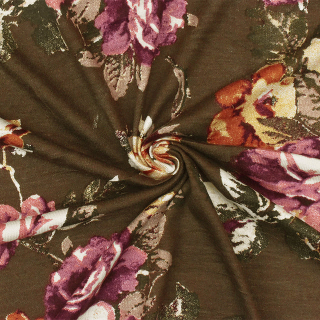 1 Yard Oak Brown-Pink-Multi Floral Printed Stretch Rayon Jersey Knit Fabric 62 Inches Wide