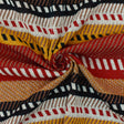 This textured double knit fabric features a bold abstract diagonal stripe pattern in red yellow and white tones. Made from a polyester cotton spandex blend, it offers light to medium weight with excellent horizontal and bias stretch plus slight vertical stretch. The full body drape and matte finish make it ideal for activewear, dresses, jackets, and casual apparel.
