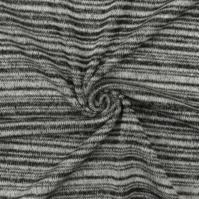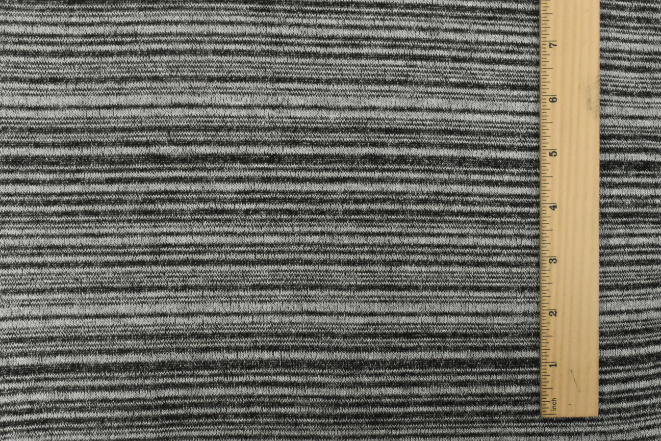 Stripe stretch jersey knit fabric in classic black and old white colors. This lightweight, opaque fabric offers a soft hand, four-way stretch, and very good drape with a matte finish. Ideal for activewear, apparel, blouses, and dresses. Machine wash cold, air dry recommended.