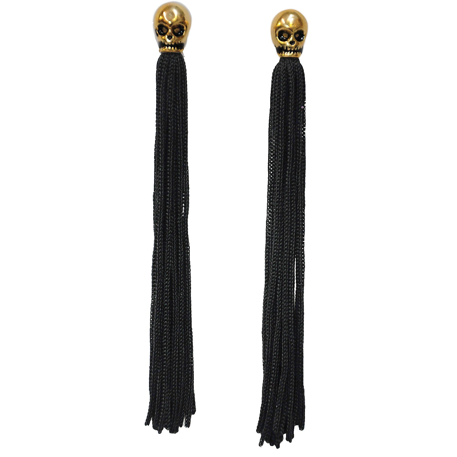 Create a unique DIY ensemble with these eye-catching earrings. Perfect for Halloween costumes, goth ensembles, or anytime you want to showcase your personal flair! The earrings include detailed metal skulls and black tassels that hang stylishly, measuring about 4 inches long.
