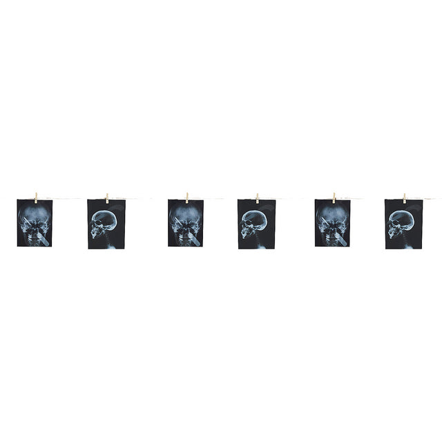 Create a spooky laboratory atmosphere with our Torture X-ray Garland. This 63-inch long garland features photo cards showcasing skull-type X-rays with embedded objects, perfect for thrilling your guests during Halloween or themed parties.