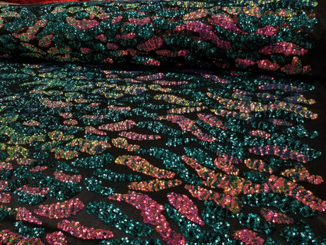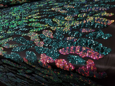 1 Yard Teal Multicolor Full Sequins Embroidered Lace Fabric on Black Tulle 50/52 Inch Width