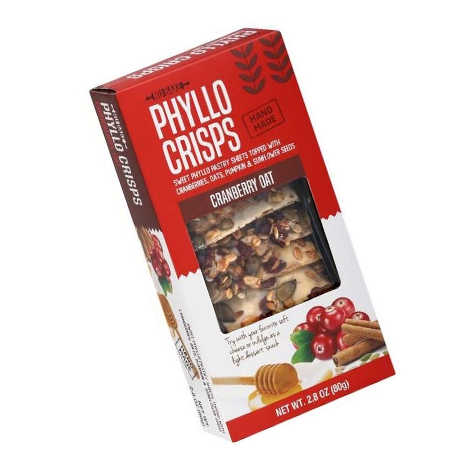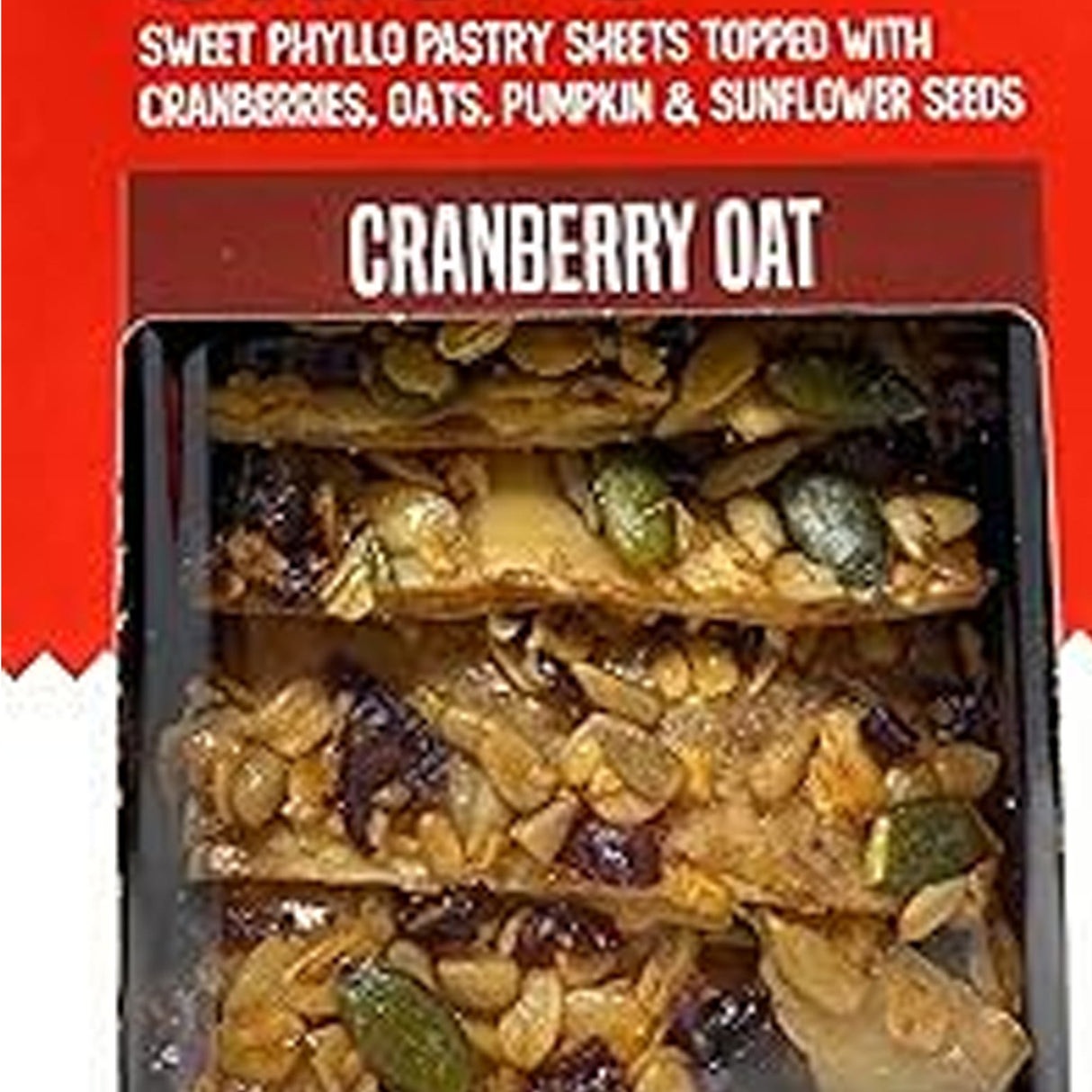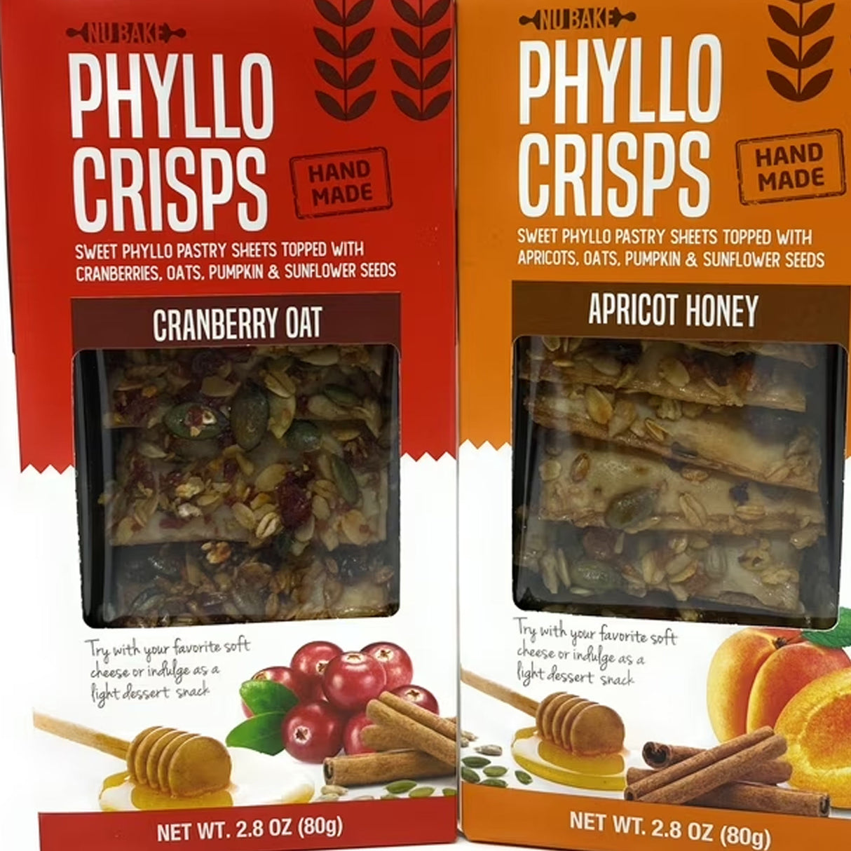 Discover a cracker that's so much more! These Phyllo Crisps feature a delicate wheat flour base layered with sweetened dried cranberries, pumpkin seeds, sunflower seeds, and oats. Glazed with honey and a touch of cinnamon, they deliver the perfect blend of crisp texture and sweet-savory flavor.