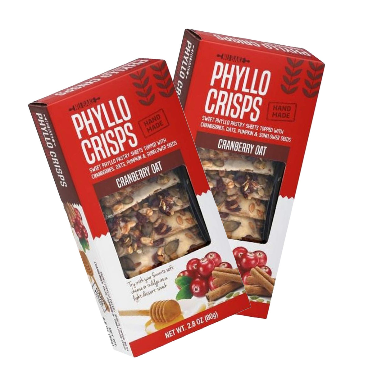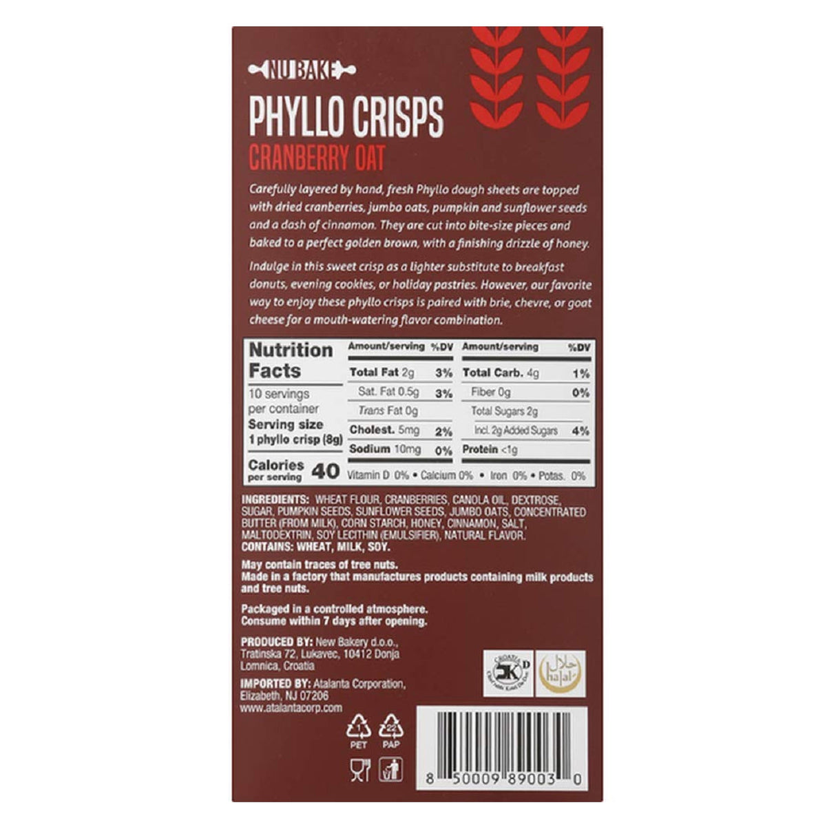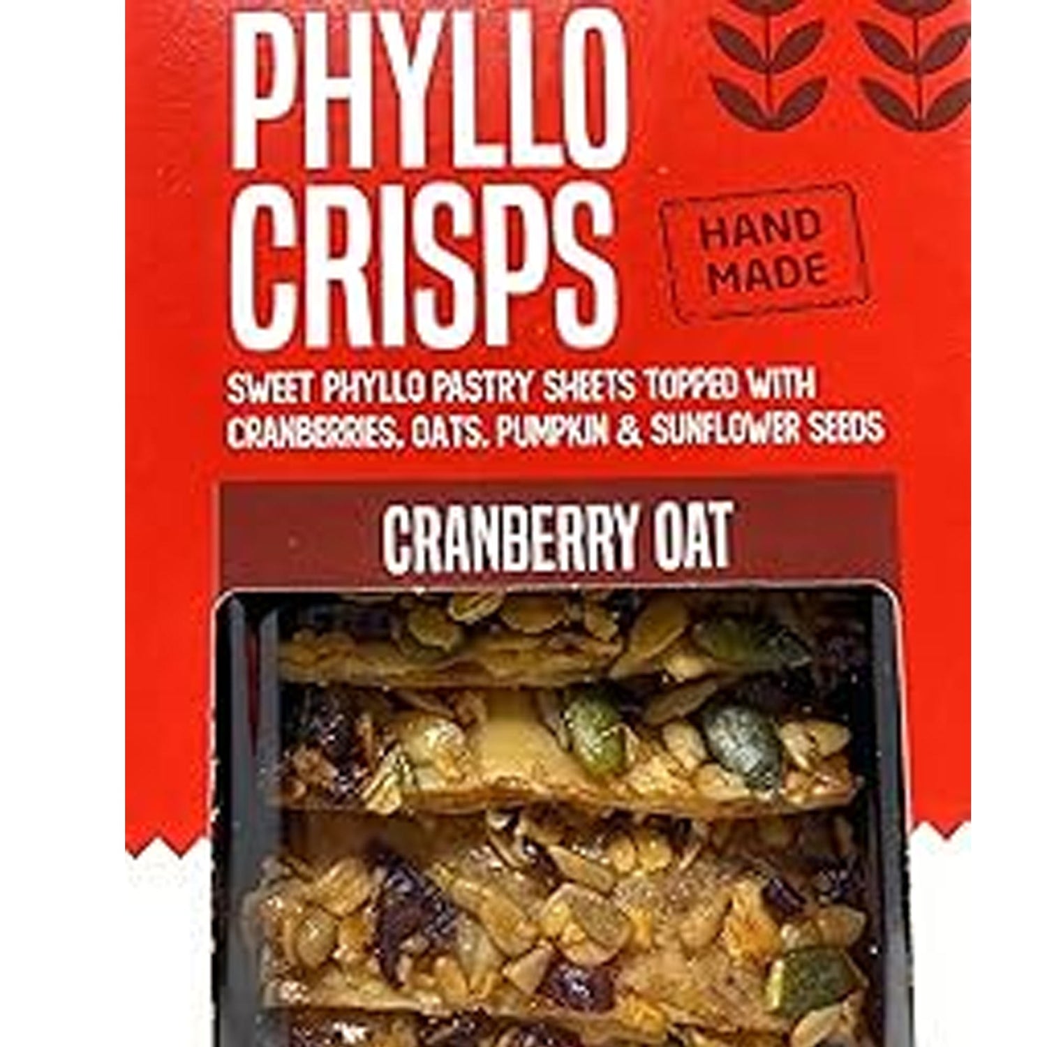 Discover a cracker that's so much more! These Phyllo Crisps feature a delicate wheat flour base layered with sweetened dried cranberries, pumpkin seeds, sunflower seeds, and oats. Glazed with honey and a touch of cinnamon, they deliver the perfect blend of crisp texture and sweet-savory flavor.