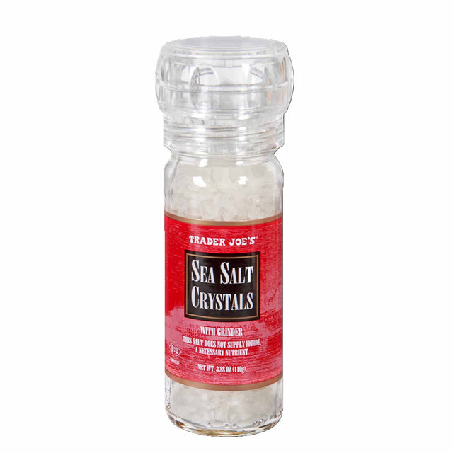 Elevate your dishes with Trader Joe's Sea Salt Crystals with Grinder. This 3.3 oz jar contains pure sea salt crystals, perfect for seasoning your favorite meals with a burst of natural flavor. The built-in grinder allows for easy, fresh grinding, giving you the perfect texture and control for your seasoning needs.