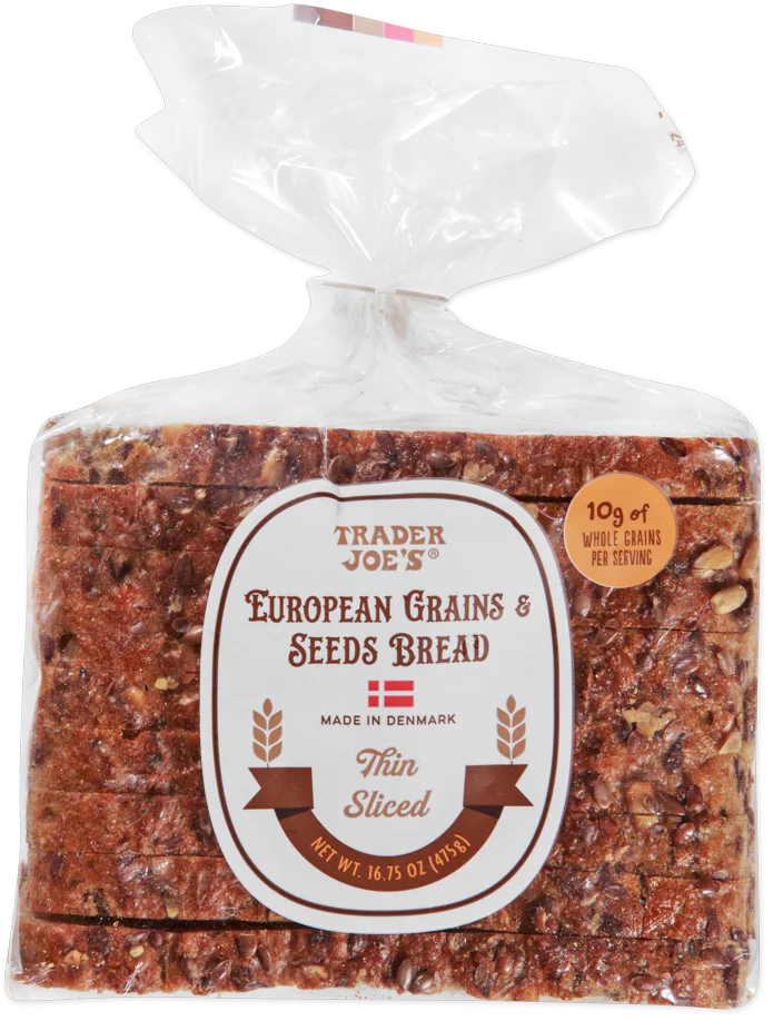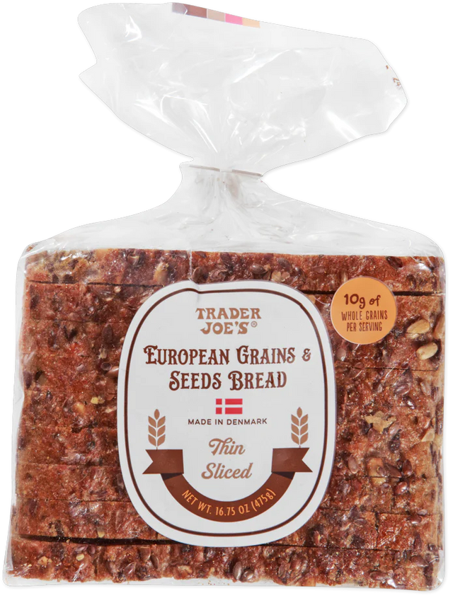 Trader Joe's European Grains & Seeds Bread adds a hearty twist to your daily bread routine. Made with a sourdough rye base, it’s enriched with flaxseeds, sunflower seeds, rye flakes, and wheat bran, then baked to a rich brown hue. Each slice is moist, slightly sweet, and nutty, perfect for a variety of toppings or as the base for open-faced sandwiches.