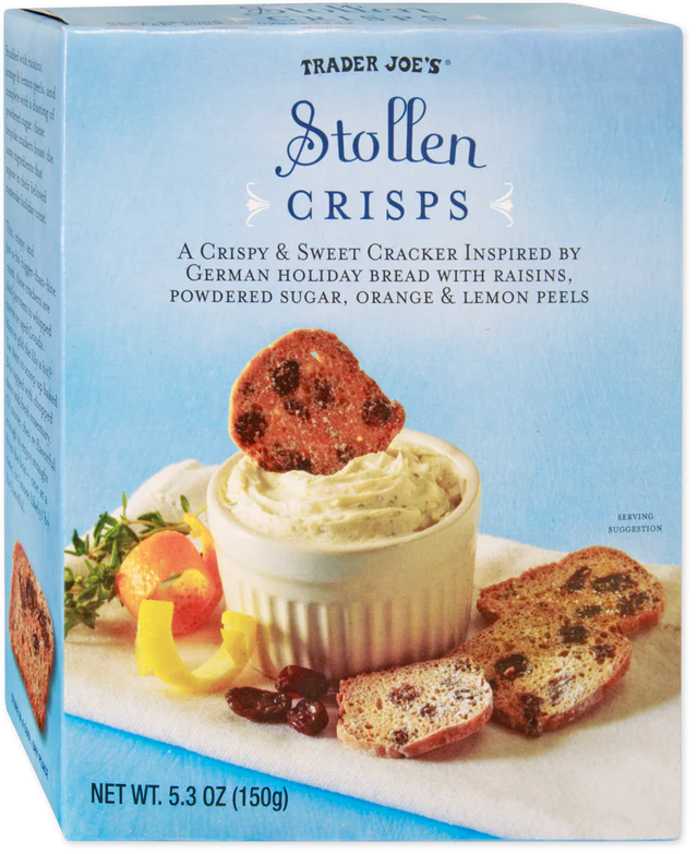 Inspired by the classic German holiday bread, Trader Joe’s Stollen Crisps bring the rich, festive flavors of stollen to a crisp and crunchy treat. These limited-edition crisps are studded with raisins, orange and lemon peels, and dusted with snowy white powdered sugar, capturing all the classic ingredients of the beloved wintertime bread.
