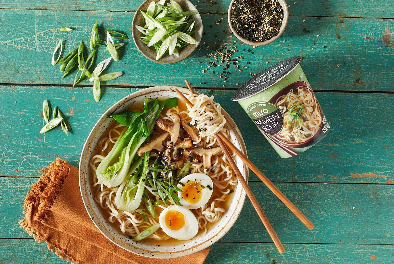Trader Joe’s Miso Ramen Soup offers a savory, umami-packed experience that stands out from typical instant noodles. The blend of seasonings, including miso, garlic, and seaweed, creates a rich broth. The addition of sunflower oil ensures a silky-smooth texture for your noodles, transforming the typical dry instant noodle experience into a savory delight. With just a few minutes of prep—either with boiling water or in the microwave—this ramen is perfect for a quick and satisfying meal. Add your favorite toppings like Sriracha Flavored Baked Tofu or Nori Komi Furikake Seasoning for an upgraded ramen experience.