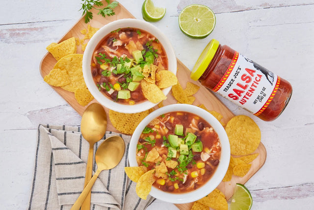 Trader Joe’s Salsa Autentica is crafted with six simple ingredients for a perfectly balanced flavor. A combination of tomato puree, yellow chili peppers, vinegar, and spices delivers a zesty, mildly spicy salsa.