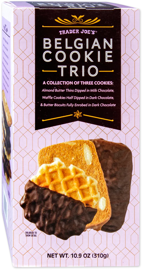 Trader Joe’s Belgian Cookie Trio features three golden, buttery cookies: almond thins dipped in milk chocolate, waffle cookies half-dipped in dark chocolate, and butter biscuits fully enrobed in rich dark chocolate.