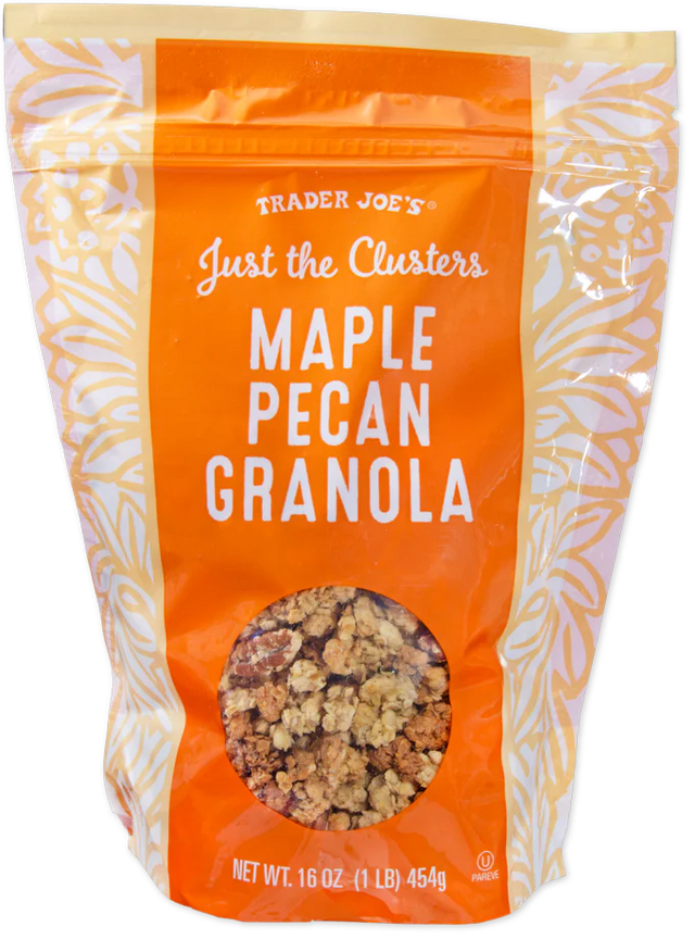 Trader Joe’s Just the Clusters Maple Pecan Granola Cereal is packed with crunchy whole grain clusters, rolled oats, real maple syrup, and crispy pecans for a deliciously sweet and nutty bite.