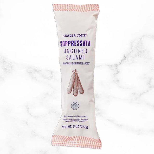 Trader Joe’s Soppressata Uncured Salami is a flavorful cured meat made from high-quality pork, seasoned with spices for a zesty taste. Crafted without nitrates or nitrites, it features sea salt, cane sugar, black pepper, garlic, and allspice in a beef collagen casing. Enjoy it on charcuterie boards, in sandwiches, or as a snack.