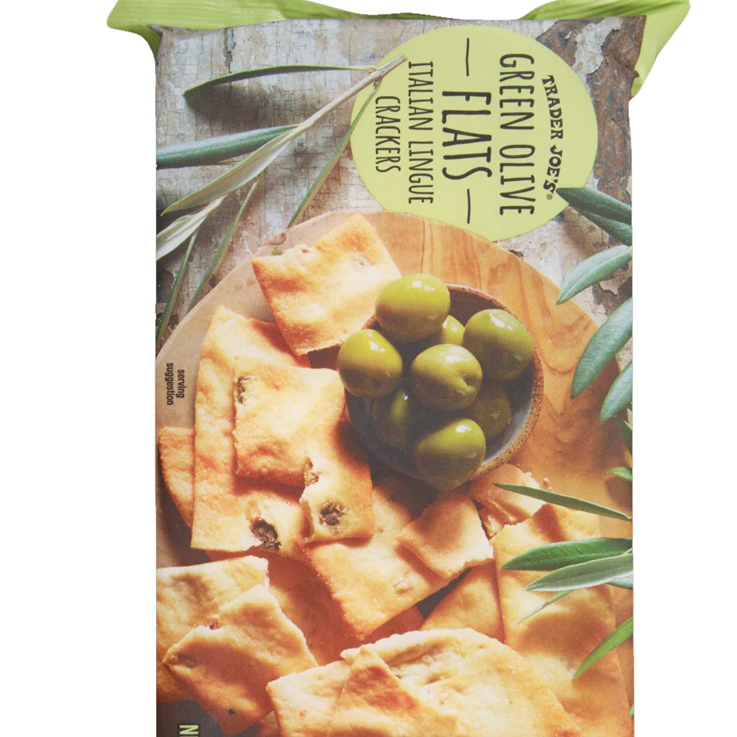 Trader Joe’s Green Olive Flats Italian Lingue Crackers are thin, crisp crackers imported from Italy, crafted in the traditional lingue style. These crackers are made by rolling savory-seasoned dough into flat, tongue-like shapes and baking them until superlatively crisp. The addition of green olives provides a delightful briny flavor, making them a perfect accompaniment to cheeses, dips, or enjoyed on their own as a savory snack.