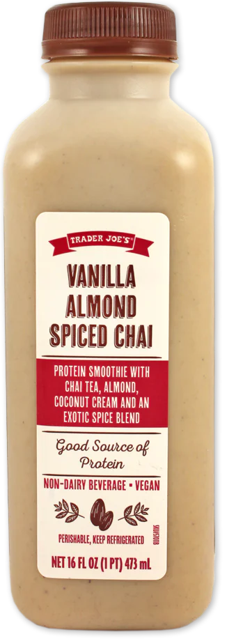 Indulge in the perfect fusion of flavors with Trader Joe’s Vanilla Almond Spiced Chai Protein Smoothie. This dairy-free and vegan beverage combines the comforting warmth of classic chai spices—cinnamon, nutmeg, cardamom, allspice, and black pepper—with the creamy richness of coconut cream, almond paste, and pea protein. With 16 grams of protein per bottle, this smooth, spiced drink delivers both flavor and nutrition.