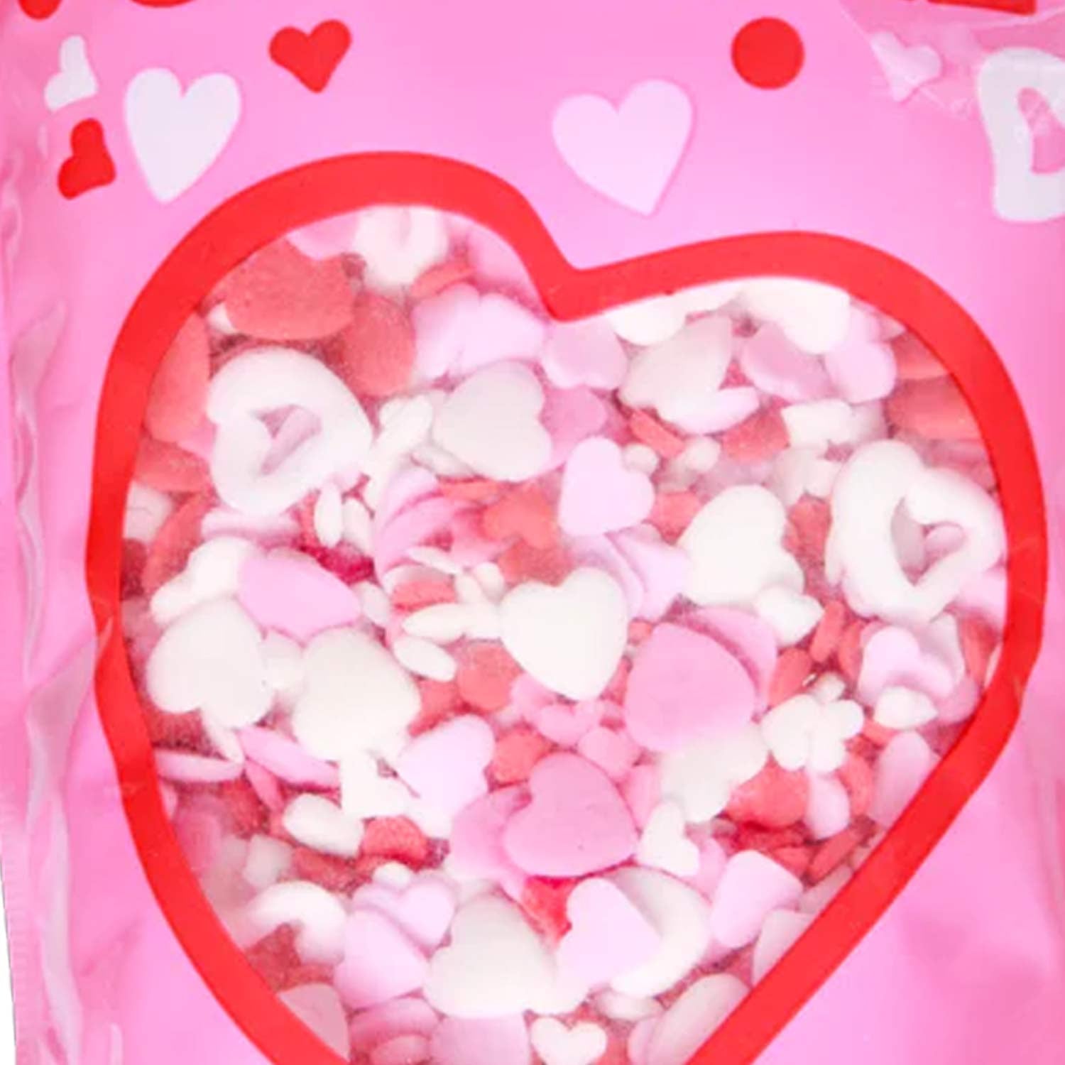 • Heart-shaped sprinkles in a mix of sizes and colors (white, pink, red)