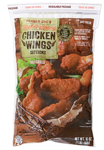 Here’s what makes our Wings soar above local pub grub: First, they come from vegetarian chickens. That means our California-grown birds are raised on a balanced diet of corn and soybean meal. They are never fed animal fat or animal by-products. Second, our Wings are 100% antibiotic-free (ABF). This is especially notable, since Trader Joe’s is currently the only retailer selling completely ABF, hot and spicy wings. Third, our Wings are super easy to prepare. They’ve been fully cooked and promptly frozen. This means they’re ready to heat at a moment’s notice, in the microwave or conventional oven.