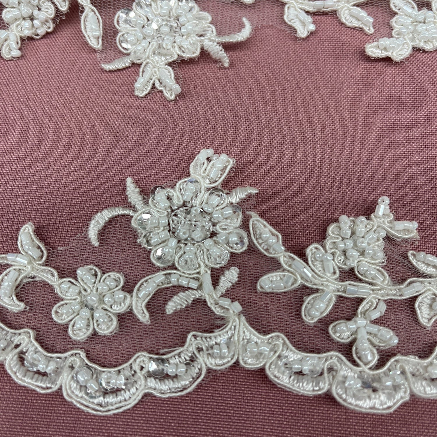 Make a stunning statement with this elegant Beaded & Corded Lace Trimming embroidered on 100% polyester net mesh. Measuring approximately 2.75 inches wide and sold by the yard, this exquisite trim features a luxurious floral design and scalloped edges. Perfect for wedding gowns, evening dresses, quinceanera dresses, and dance costumes, it adds glamour and sophistication to any special occasion outfit. Available in 2 classic colors. Ships within 24 business hours.