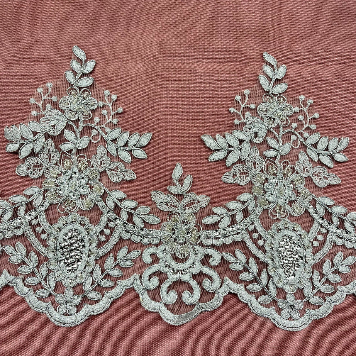 Introducing our exquisite Beaded & Corded Lace Trimming embroidered on 100% polyester net mesh. This durable, heavyweight trim features pearls, sequins, and tulle, making it perfect for wedding dresses, evening gowns, quinceañera dresses, dance costumes, and other special occasion garments.