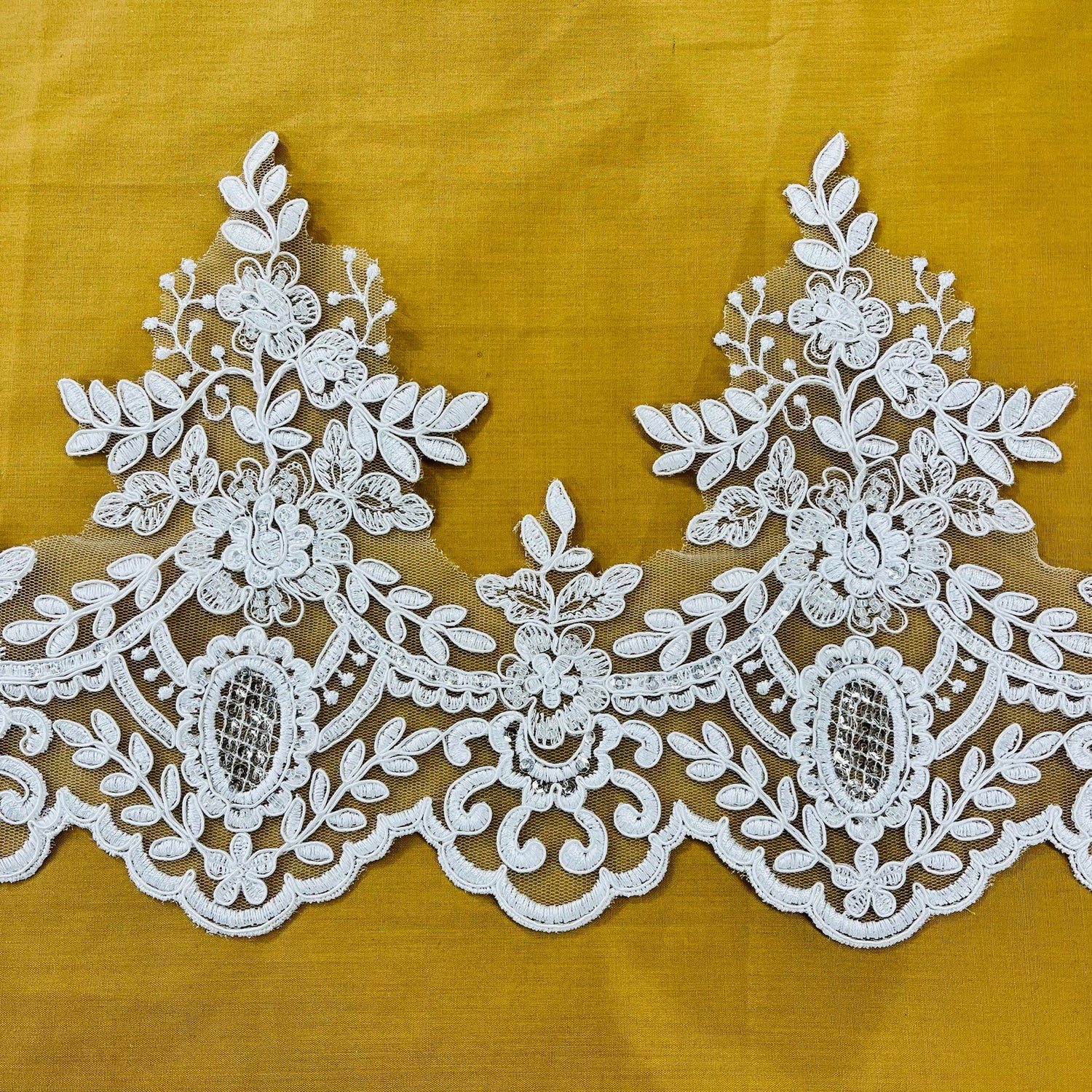 1 Yard Trimming Embroidered on 100% Polyester Net Mesh 8" Wide Beaded & Corded Lace - White is backordered and will ship as soon as it is back in stock.