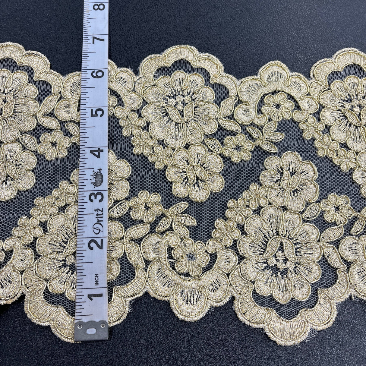 1 Yard Corded Double Sided Lace Trimming Embroidered on 100% Polyester Net Mesh 6.5" Wide - Gold is backordered and will ship as soon as it is back in stock.