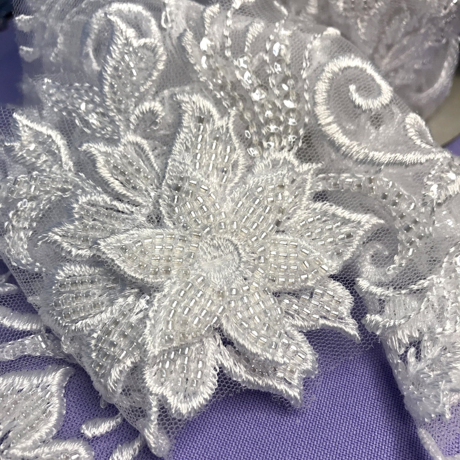 - Design: Three dimensional floral lace with intricate beading