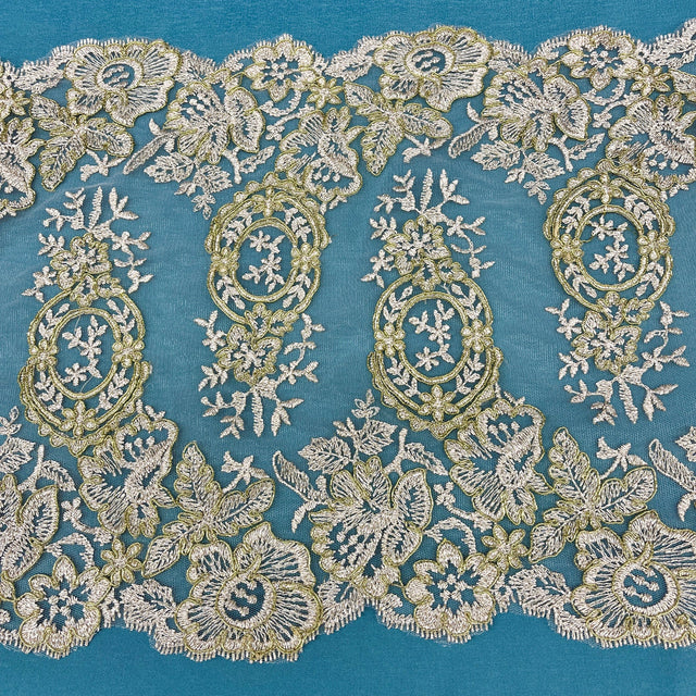 Transform your formalwear and special occasion garments with our Corded Double Sided Lace Trimming embroidered on premium polyester net mesh. This intricately handmade trim offers dramatic width and elegant detail, ideal for bridal gowns, quinceañera dresses, dance costumes, and evening wear.